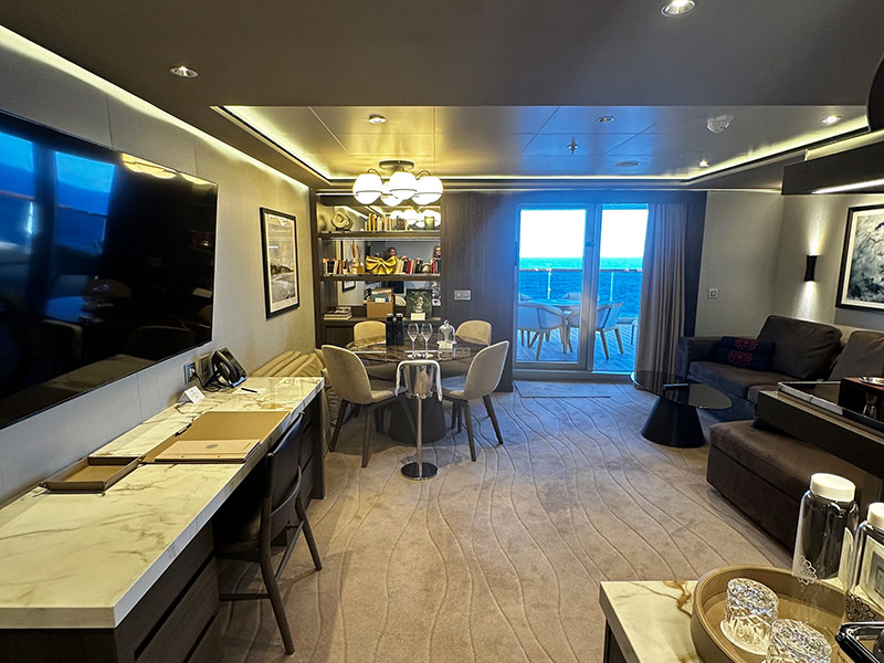 Sie bietet einen weitläufigen, stilvoll eingerichteten Wohnbereich, einen bequemen Speisebereich für acht Gäste und ein separates, geräumiges Schlafzimmer mit Meerblick. Hinzu kommen ein komfortabler Arbeitsbereich und ein Bad aus kostbarem Calacatta-Marmor mit Badewanne und separater Dusche, ein privates Dampfbad und ein begehbarer Kleiderschrank. Die Suite besitzt auch ein zusätzliches Gästebad.